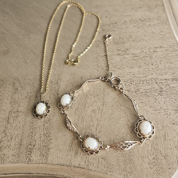 When I was in high school my father gave me a bracelet like this for my birthday. Opal is my birthstone. Last Christmas I gave it to my granddaughter. I have never seen one like it before. I almost cried when I saw this post. I am 72 years old . My father died 50 years ago. Guess I should just say thank you so much for the memories and the bracelet and necklace are beautiful❤️