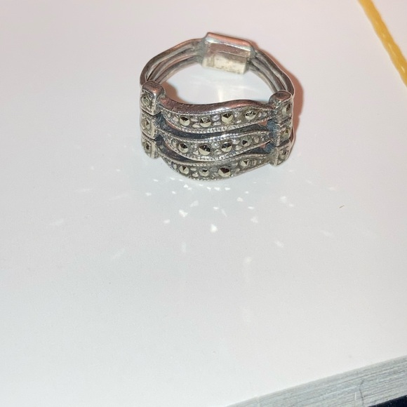 Gorgeous sterling silver and Marcasite pinky ring with triple band in a wave pattern.