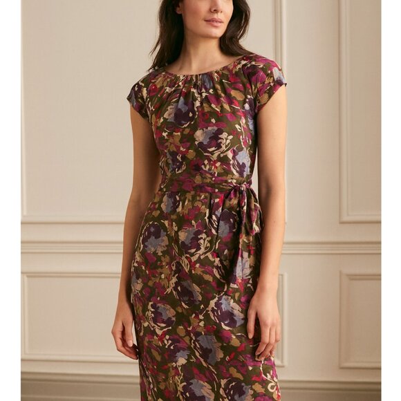 Gorgeous Boden floral dress. The olive green background and multicolor print are beautiful, and the viscose silk blend has a lovely drape. The column shape with tie belt creates a flattering, polished look.
