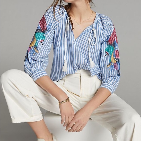 Anthropologie Tops - Anthropologie Adagio Embroidered Striped Peasant Blouse