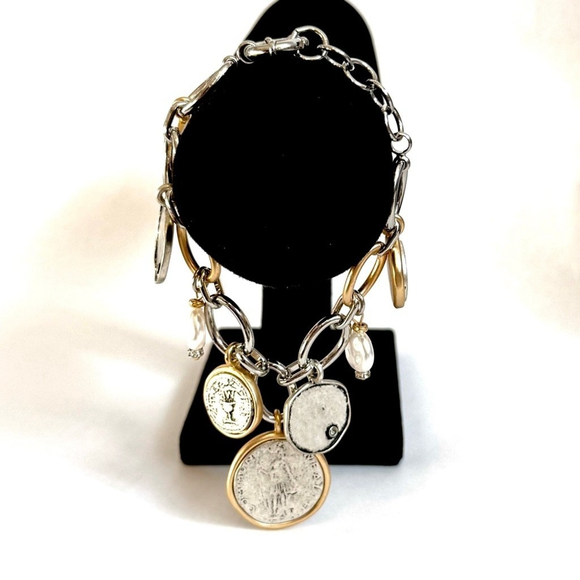 Really pretty bracelet! I love the two toned look and the antiqued coins! Fast service and included a matching pair of earrings. Great job!!!