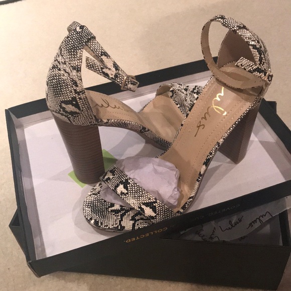 Lulus Shoes - TAYLOR BEIGE SNAKE STACKED ANKLE STRAP HEELS