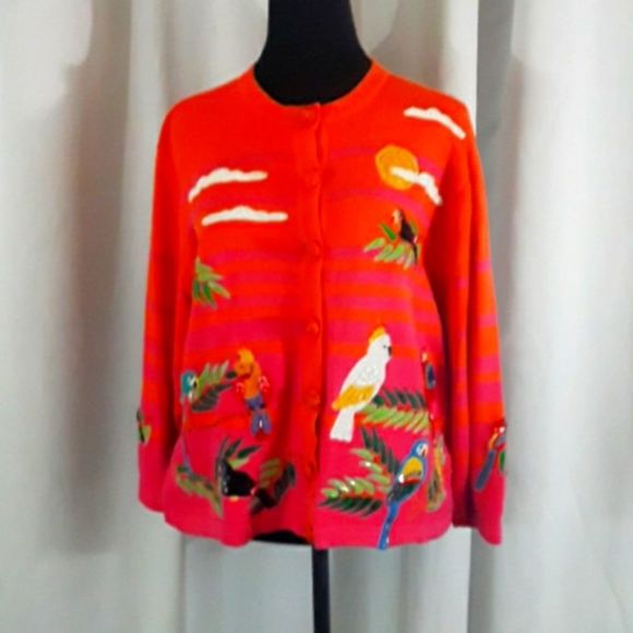 Cute colorful sweater with an array of beaded birds. Thank you.