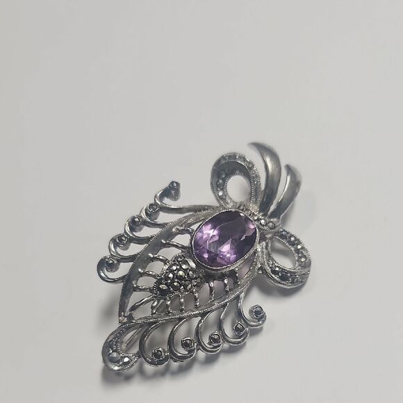 Beautiful sterling silver Amethyst and Marcasite brooch. The design of this brooch is very open and airy. Gorgeous!