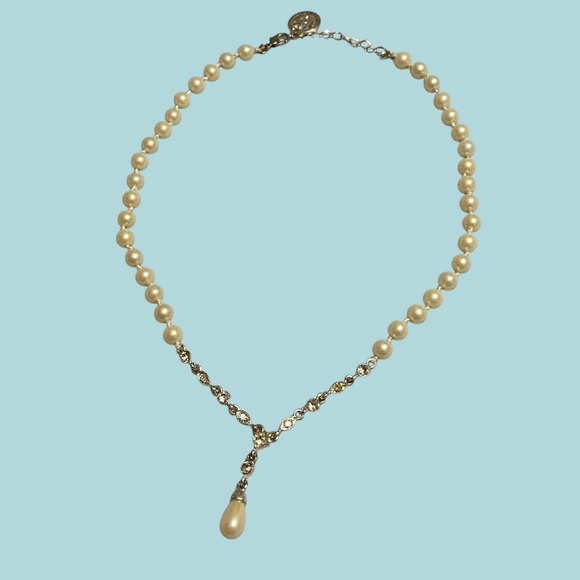 Fantastic Crown Trifari faux pearl teardrop ne klace with rhinestones. This piece will elevate any outfit.