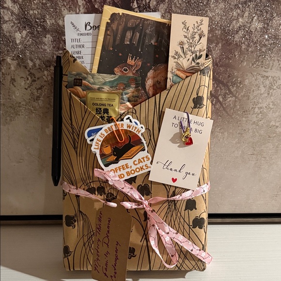 Such amazing wrapping. I almost hate to tear it open it’s so pretty. Ty i love the book item!!!!!