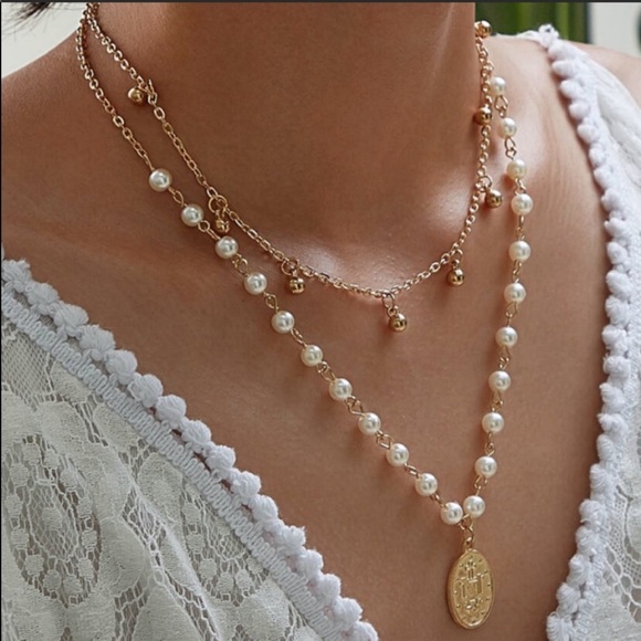 Jewelry - Gold Layered Pearl Oval Religious Medal Necklace
