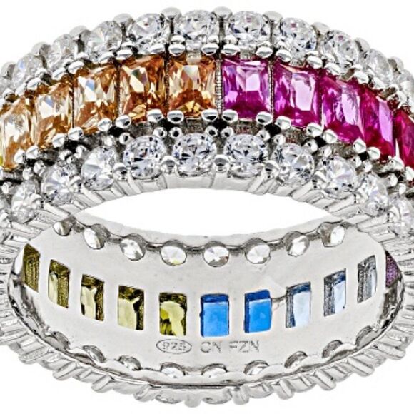 Gorgeous rhodium over sterling silver multicolored gemstone eternity ring. Such amazing colors, I love the design with the clear CZs on top and underneath the row of gemstones. Just exquisite. It is in excellent condition and is as described. I appreciate the care put into wrapping and packaging this beauty as well as the fast shipping. Thank you for a wonderful transaction. Take care, stay safe and be well. All the best to you!