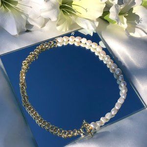 half freshwater pearl half cuban 14k gold plated chain choker/necklace