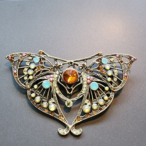 Exquisite Austrian crystal butterfly brooch. The design of the gold-tone filigree work and multicolored crystals is unbelievably elegant.