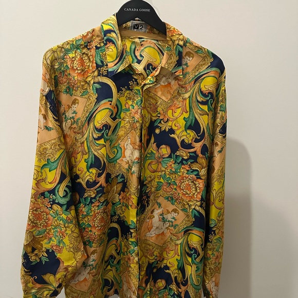 Beautiful authentic vintage Versace silk shirt described very honestly. Fast shipping great deal could not ask for better thank you very much.