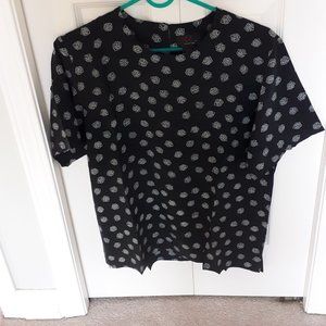 Black 100% silk top, white floral pattern, size M
