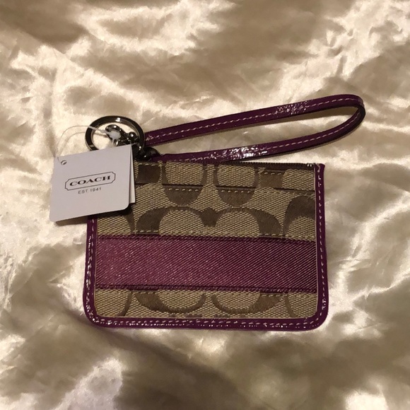 New with tags and I've wanted this for months. She was patient with me. I bought the Coach bag in the same color of purple which is hard to find. Now I have a small and easy to carry ID purse,all I need is ID,debit card,and a little bit of cash. Please shop with her. Quick shipping. Perfect product