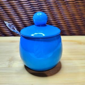 Vintage Made in Japan Sugar Jar with Spoon Stunning Blue Color.