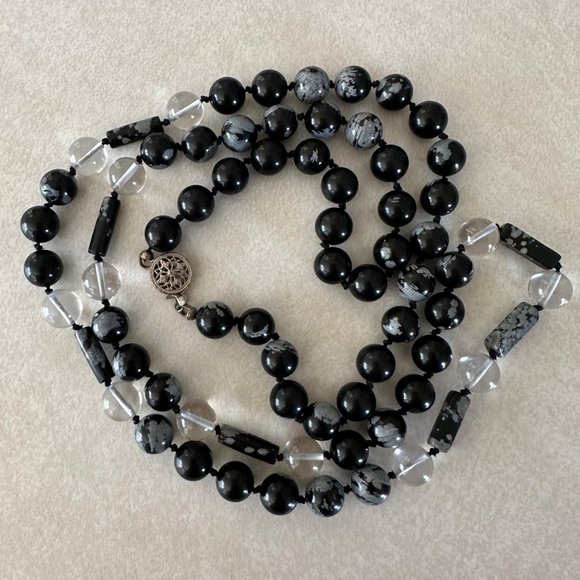 Unique necklace with snowflake black obsidian and clear glass beads. Gorgeous!