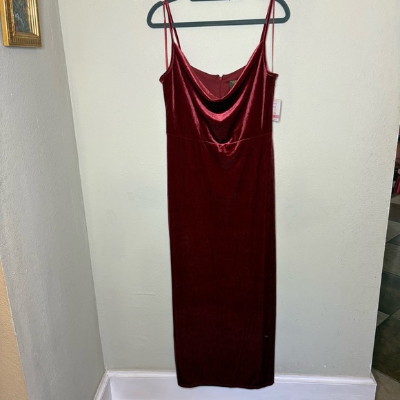 Thank you! Dress arrived as described, original tags still on it. Fits perfect!!! It definitely is a lighter red, not quite raspberry and not true red. The velvet is very stretchy, shimmery and comfortable. Great purchase.