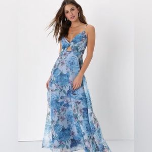 NWT Lulus Enchanting Entrance Blue Floral Organza Keyhole Maxi Dress