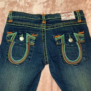 Colourful stitched true religion jeans😍 size 30. low rise flare