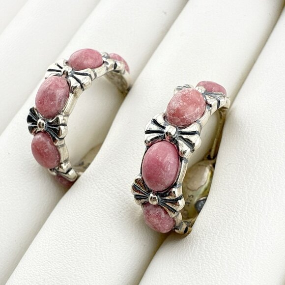 Beautiful Shube Dakota pink Rhodonite cabochon hoop earrings set in sterling silver.