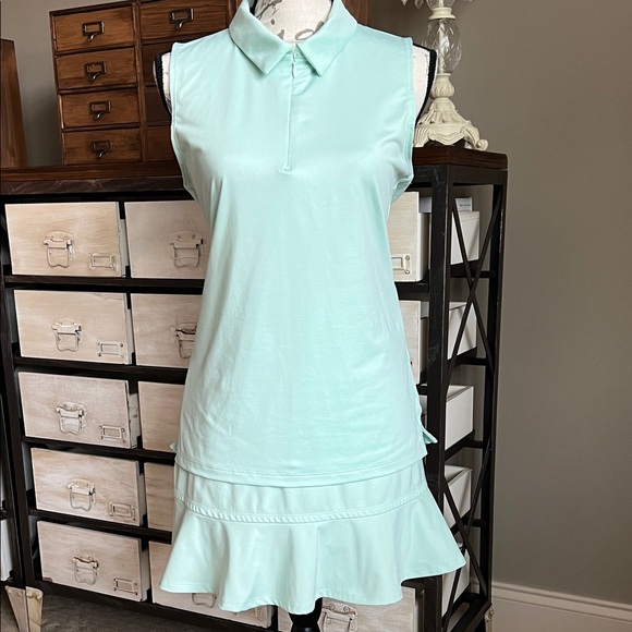 Tommy Bahama Mint Green Skort set is fabulous! Sleeveless mock neck zippered top matches perfectly with pull on elastic waist skort with ruffled hemline. The set was quickly mailed, securely packaged, arrived in excellent condition & looks exactly as described. Great price,quality & value! I am very happy with my Tommy Bahama skort set purchased from this seller & will shop again for more quality sports clothing.