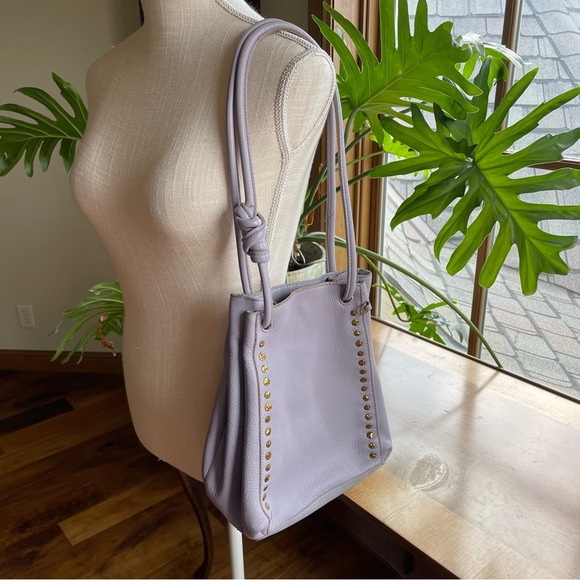 This is such a lovely lavendar lilac shade! The suede bag is a fairly simple design that has just enough detail with the pale gold nailhead trim and the large knotted strap. It came in clean and great condition and at a great price. I appreciate it. Thanks so much! Best, Dixie