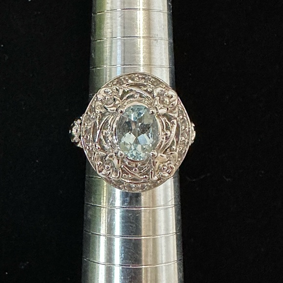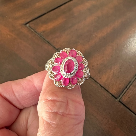 Exquisite sterling silver filigree ruby ting with scalloped edge.