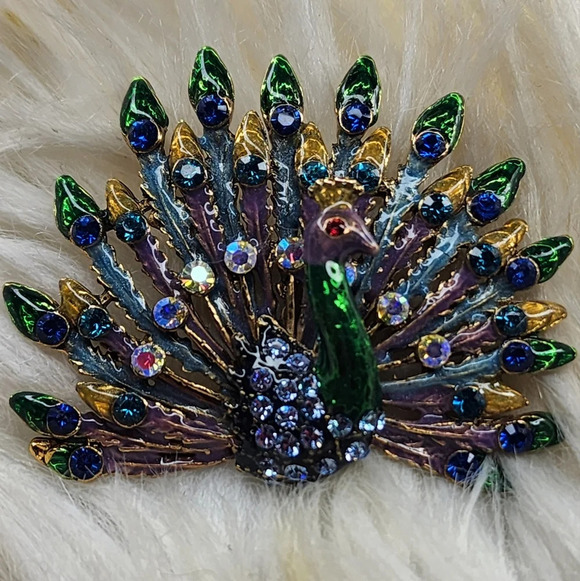 This peacock rhinestone brooch is gorgeous. With blue, green, and clear rhinestones along with green enameling it should compliment any outfit. Thank you fir the amazing orange, black and rhinestone butterfly brooch. LOVE THEM!