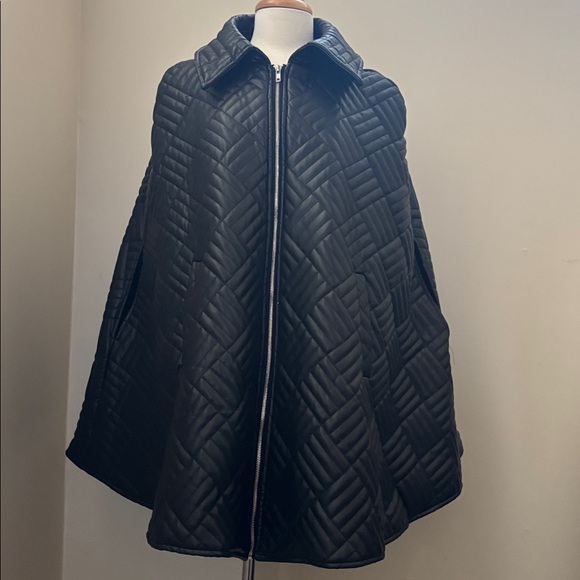 Nice cloak in a faux leather quilted style...very comfortable and perfect for as a layered look in colder weather. Looks great with a colorful scarf.