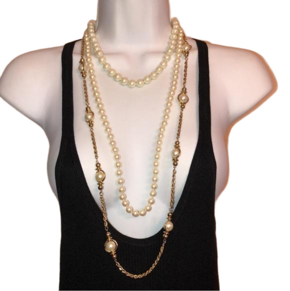 What a bargain. Three wonderful faux pearl necklaces. The first is an extremely long gold-tone chain necklace with large pearls encircled by gold circle; then comes the long hand knotted pearl necklace, followed by the pearl chocker. Whether worn together or separately, this trio is stunning.