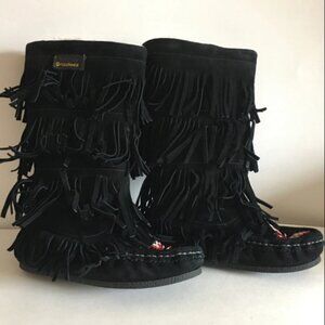 Grizzleez Ziginy Beaded Moccasins Women's 3 Layer Fringe Boots Black Size 6.5
