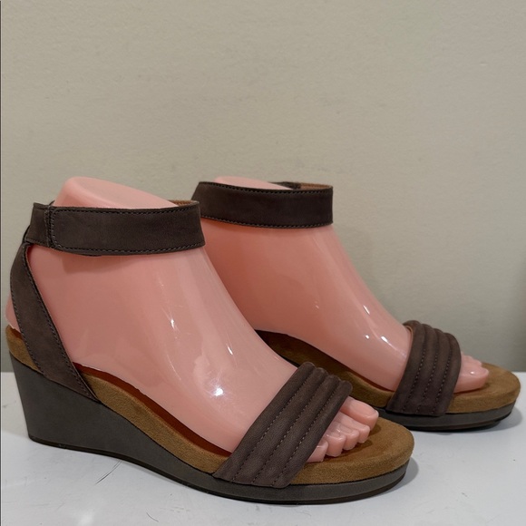 TY. Love the Lucky brand taupe leather wedge sandals. Comfy. Have a blessed day.