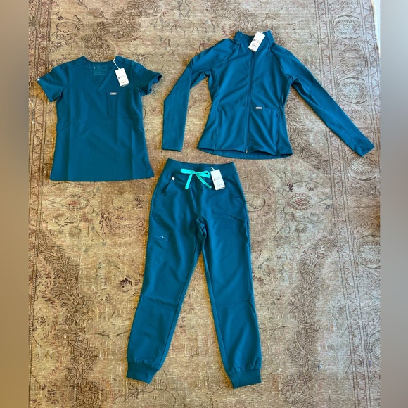 Wrapped in Christmas paper ☺️ came in a figs box with a sticker ! Clean beautiful scrub set! 💙