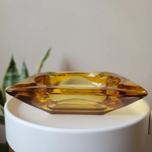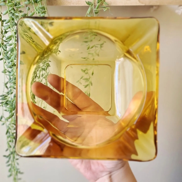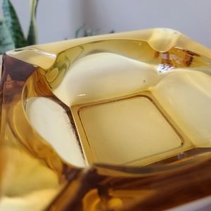 Let the good times roll with this mid-century modern Amber Glass Ahhtray. Made with heavy amber glass that shines beautifully in the sun and four doobie/cigarette holders with a deep centre for ash.