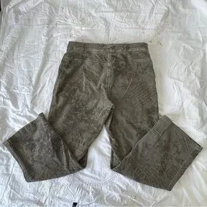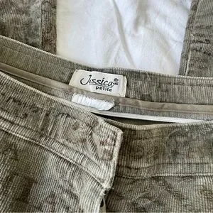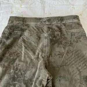 Vintage Jessica pants in a muted olive wash featuring layered script, floral, and paisley motifs throughout. Unique Y2K statement piece with a structured feel and flattering straight leg fit.