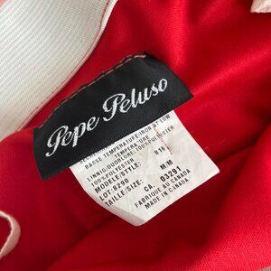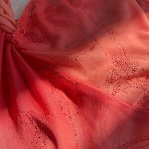 Flowy pink strapless prom/formal dress from Pepe Peluso. Features shimmery embellishments all over and ruching on one side. Made in Canada!