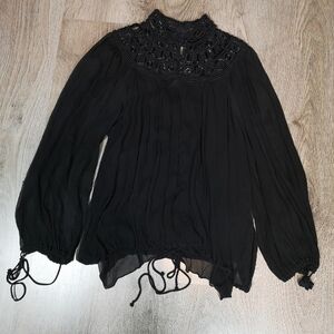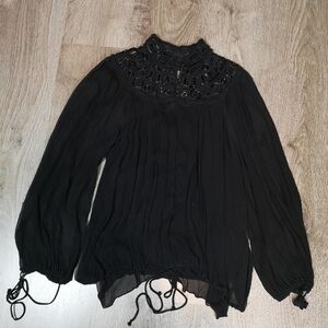 00s Vintage Victorian Gathered Gothic Beaded Neck Mandarin Collar Boho Top