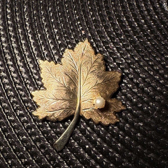This is a vintage Sarah Coventry gold-tone maple leaf brooch with a faux pearl accent.