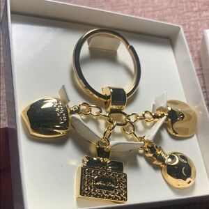 This luxurious Dior accessory features a gold-toned key and card holder adorned with intricate charms, including a square, spherical, and shield-shaped design. The elegant metallic finish adds a touch of sophistication, while the playful movement of the charms creates a delightful jingle.