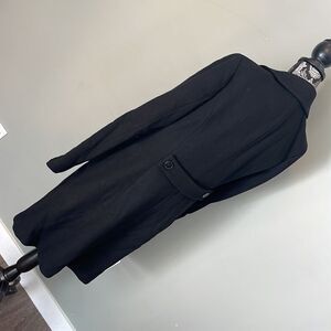 Warm, stylish walker coat in a boxy fit Notch lapels Long sleeves Button front Waist flap pockets Centred back vent Fully lined About 36" from shoulder to hem 55% wool/35% polyester Dry clean