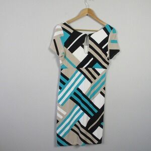 Keywords: ONE dress, midi dress, geometric print dress, casual dress, stretch dress, italian made, size 44, blue black dress, womens dress, summer dress, vacation dress, day dress, viscose dress, comfortable dress