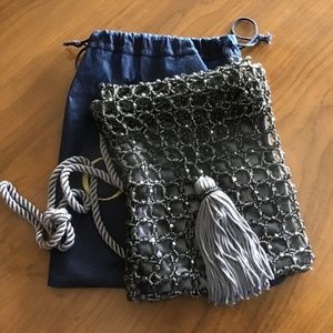 This is a Lovely Circa 90’s Small shoulder bag with Silver/Grey lining and tassel with dark Grey/Black Beads with a silk rope as a shoulder handle. It has a zipper.