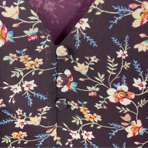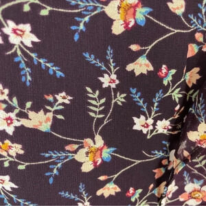 Cute and flowy - a purple floral top from 1. State. Cap flutter sleeves. Ruffle detail front and back. V-neck. 3 buttons at bust. Sheer, lined in purple. 100% polyester.