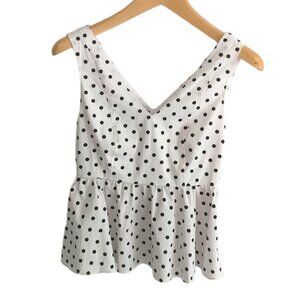 This a white and black polka dot print sleeveless peplum blouse by 1. State.