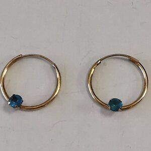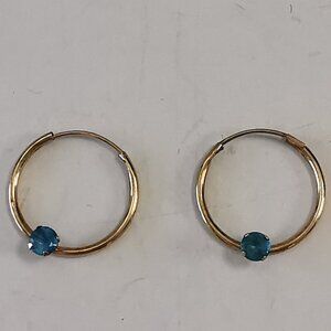 Dainty 10 kt gold hoop earrings with a tiny blue topaz stone.