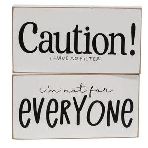 Add a touch of humor to farmhouse displays with the Not For Everyone Block Sign assortment. These simply designed wooden blocks have a mix of black text and script on white backgrounds with distressed edges. They measure 3" high by 6" wide with a .75" depth. One sign proclaims, ‘Caution! I have no filter.’ The other humorously warns, ‘I’m not for everyone.’ These fun signs look great on shelves, kitchen countertops, and coffee tables.