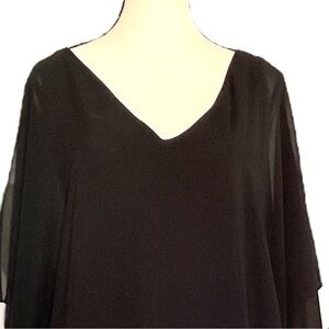 Colebrooke by windsmore- black & white colour block chiffon poncho coverup top with inner longline viscose/spandex blend attached tank top. Outer layer is sheer with split arm between shoulder & elbow. Gorgeous quality piece in like new condition. Perfect for travel/ cruise or resort wear.tagged a size small but can accommodate a variety of sizes easily. Please refer to measurements provided.