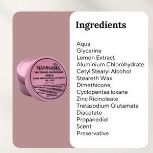 Ingredients: Namnama ethically sourced all our products and make sure that they are FDA PH approved. We also make sure that all ingredients are natural and have no harsh effects. Specific ingredients are as follows: Aqua, Glycerine, Lemon Extract, Aluminium Chlorohydrate, Cetyl Stearyl Alcohol, Steareth Wax, Dimethicone, Cyclopentasiloxane, Zinc Ricinoleate, Tretasodium Glutamate, Diacetate, & Propanediol, Scent, Preservative