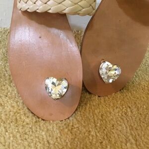 The 100% Capri sandals are characterized by their beige color, braided straps, heart shaped jewelled embellishment at the tie.