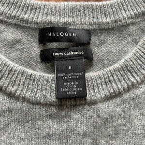 Extremely soft light gray 100% cashmere sweater by Halogen. Good used condition with one very small pull - really not noticeable unless you are looking for it - see photo