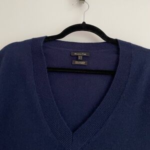 100% cashmere sweater in navy color. Straight cut with slits at the side seams, slightly low/high, v-neck.